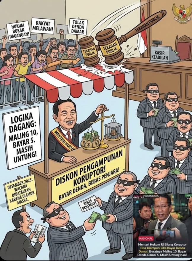 Analogi “Maling 10, Bayar 5” yang viral di media sosial menjadi simbol perlawanan. Wacana ini dianggap mengubah hukum pidana menjadi hukum dagang, di mana keadilan bisa dibeli dan dosa bisa ditebus dengan transfer bank.