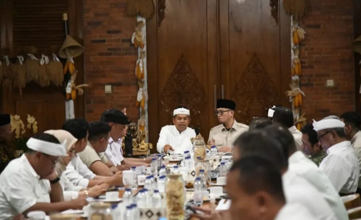 Bupati Bogor, Rudy Susmanto menghadiri Rapat Koordinasi Strategis bersama Wakil Menteri (Wamen) Haji dan Umrah, Dahnil Anzar Simanjuntak, serta Gubernur Jawa Barat, Dedi Mulyadi, bahas penguatan layanan haji dan umrah, di Lembur Pakuan, Subang, Kamis (4/12/2025).